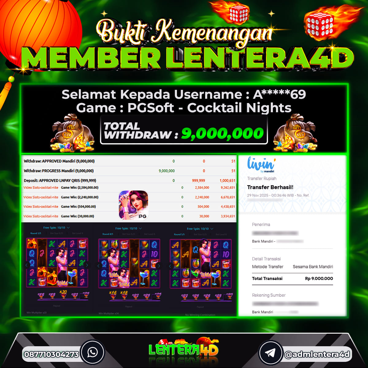 JACKPOT MAIN COCKTAIL NIGHTS 29 NOVEMBER 2025, Jackpot Slot Gacor, Kemenangan Slot, Bukti Kemenangan Slot, Kemenangan Slot PG SOFT, Menang Slot online, Slot Gacor, Situs Aman Terpercaya, WD Berapapun Pasti DI Bayar Tuntas, Maxwin Slot Online.
