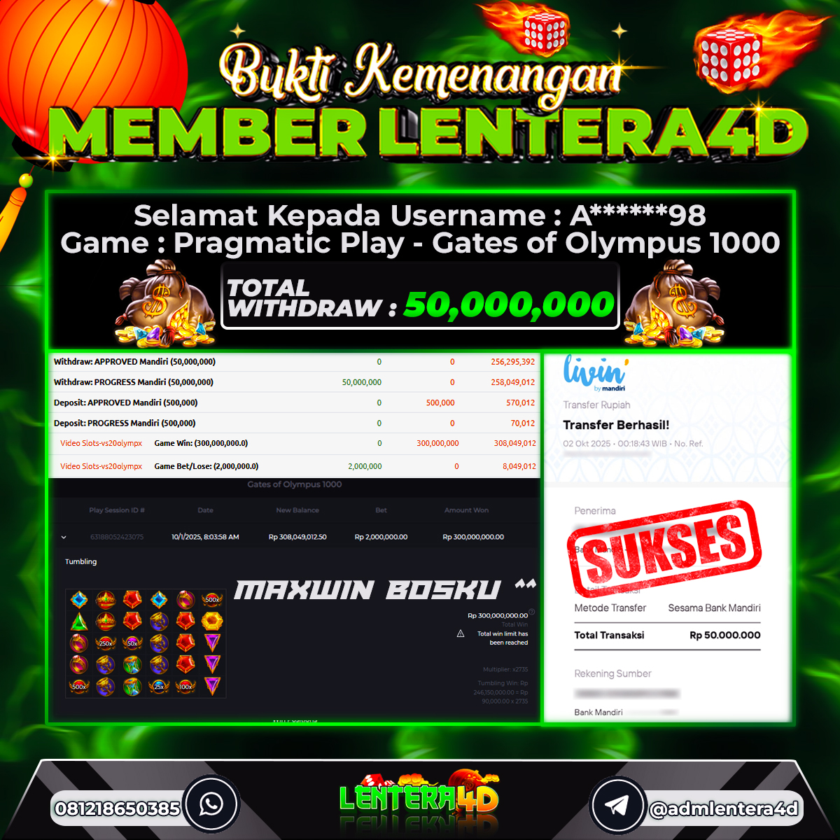Satu lagi Bukti JP dan Pembarayan Sah Dan Dapat Dipertanggung Jawabkan, WD Berapapun Pasti Dibayar Lunas Hanya di Situs LENTERA 4D. Hati Hati Kepada Pihak Pihak Yang Mengatas namakan Pihak LENTERA4D Untuk Melakukan Penipuan.