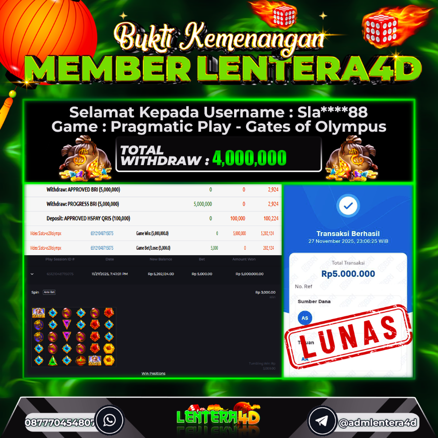 Setiap hari, member Lentera4D berhasil meraih jackpot besar dari berbagai provider slot ternama yang kami sediakan, seperti Pragmatic Play, Habanero, PG Soft, dan masih banyak lagi. Kami secara rutin menampilkan bukti screenshot atau rekapan kemenangan yang berhasil diraih, mulai dari kemenangan ratusan ribu hingga puluhan juta rupiah. Semua slip kemenangan ini kami hadirkan untuk membuktikan bahwa di Lentera4D, peluang menang itu nyata.