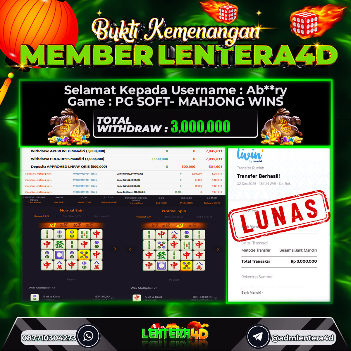 JACKPOT MAIN MAHJONG WAYS 02 DESEMBER 2025, Jackpot Slot Gacor, Kemenangan Slot, Bukti Kemenangan Slot, Kemenangan Slot PG SOFT, Menang Slot online, Slot Gacor, Situs Aman Terpercaya, WD Berapapun Pasti DI Bayar Tuntas, Maxwin Slot Online.