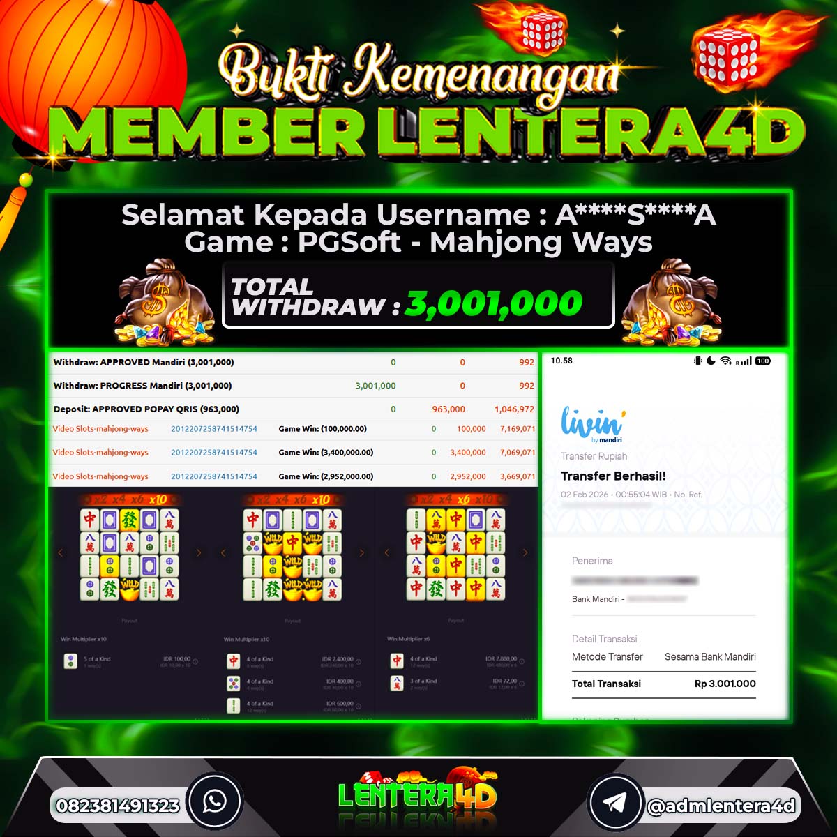 Setiap hari, member Lentera4D berhasil meraih jackpot besar dari berbagai provider slot ternama yang kami sediakan, seperti Pragmatic Play, Habanero, PG Soft, dan masih banyak lagi. Kami secara rutin menampilkan bukti screenshot atau rekapan kemenangan yang berhasil diraih, mulai dari kemenangan ratusan ribu hingga puluhan juta rupiah. Semua slip kemenangan ini kami hadirkan untuk membuktikan bahwa di Lentera4D, peluang menang itu nyata.