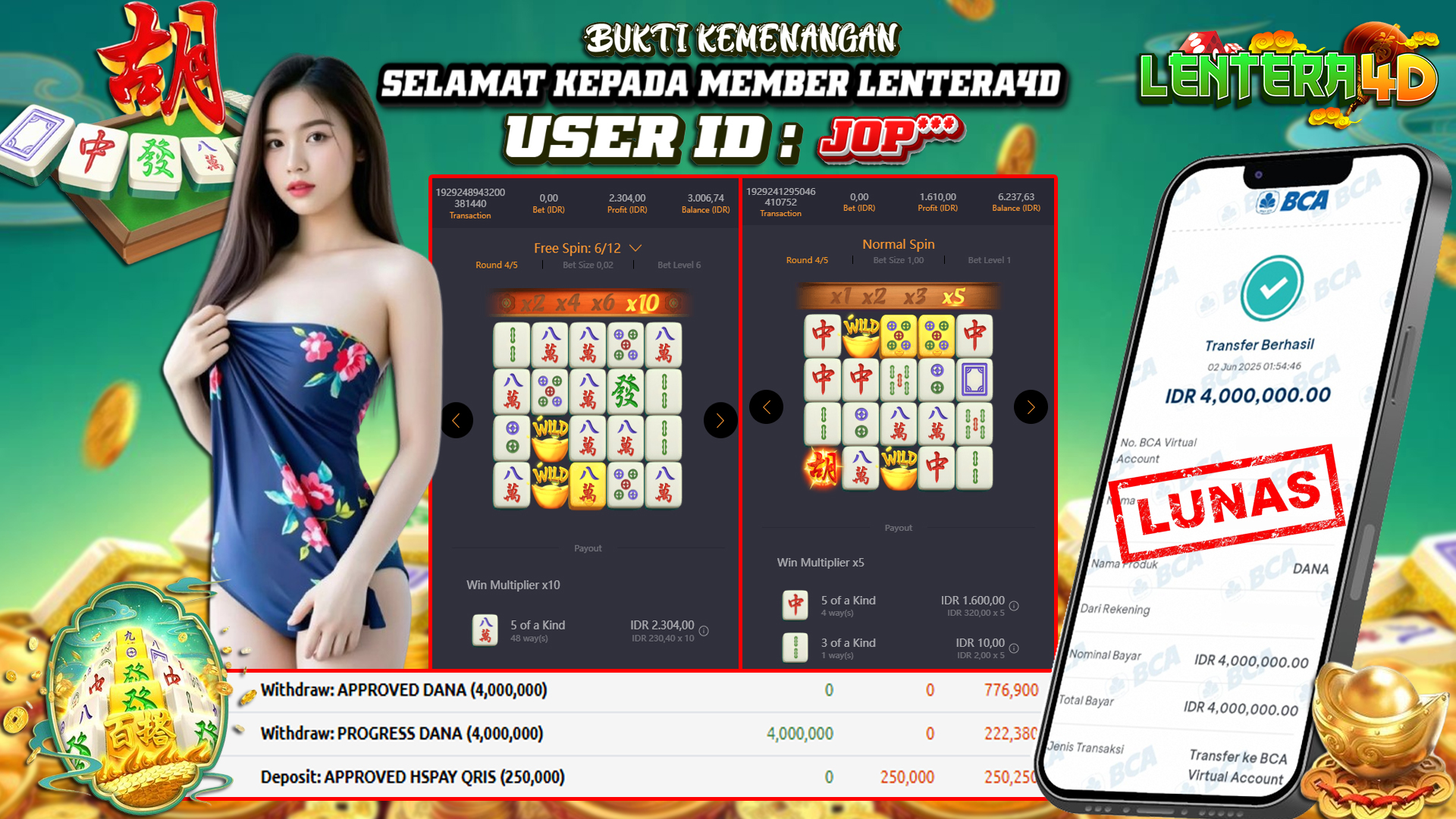 Lentera4D dikenal sebagai situs terpercaya yang selalu menghadirkan pengalaman bermain slot online yang aman, fair, dan berlisensi resmi. Di sini, kami tidak hanya sekadar memberikan janji, tapi bukti nyata berupa slip kemenangan yang dapat Anda lihat secara langsung.