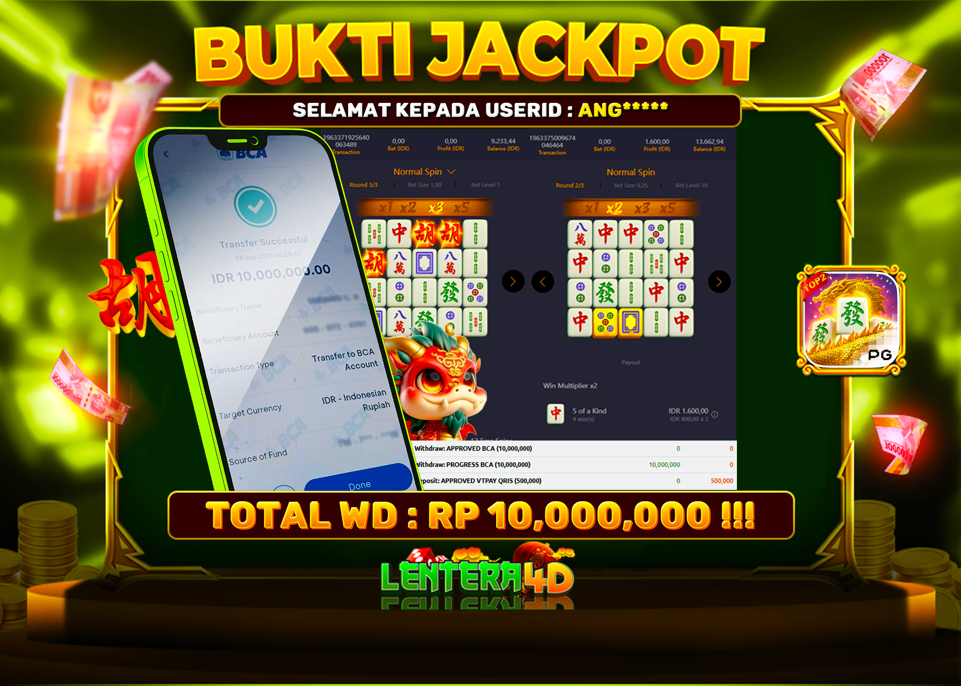 Setiap hari, member Lentera4D berhasil meraih jackpot besar dari berbagai provider slot ternama yang kami sediakan, seperti Pragmatic Play, Habanero, PG Soft, dan masih banyak lagi. Kami secara rutin menampilkan bukti screenshot atau rekapan kemenangan yang berhasil diraih, mulai dari kemenangan ratusan ribu hingga puluhan juta rupiah. Semua slip kemenangan ini kami hadirkan untuk membuktikan bahwa di Lentera4D, peluang menang itu nyata.