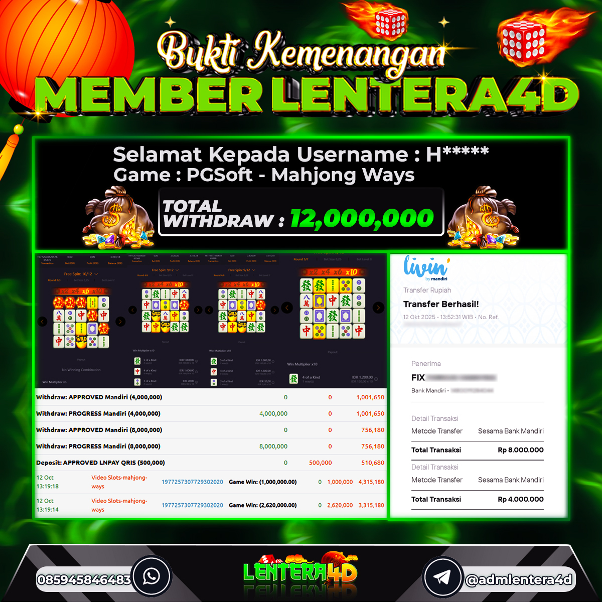JACKPOT MAHJONG WAYS 12 OKTOBER 2025, Jackpot Slot Gacor, Kemenangan Slot, Bukti Kemenangan Slot, Kemenangan Slot PG SOFT, Menang Slot online, Slot Gacor, Situs Aman Terpercaya, WD Berapapun Pasti DI Bayar Tuntas, Maxwin Slot Online.