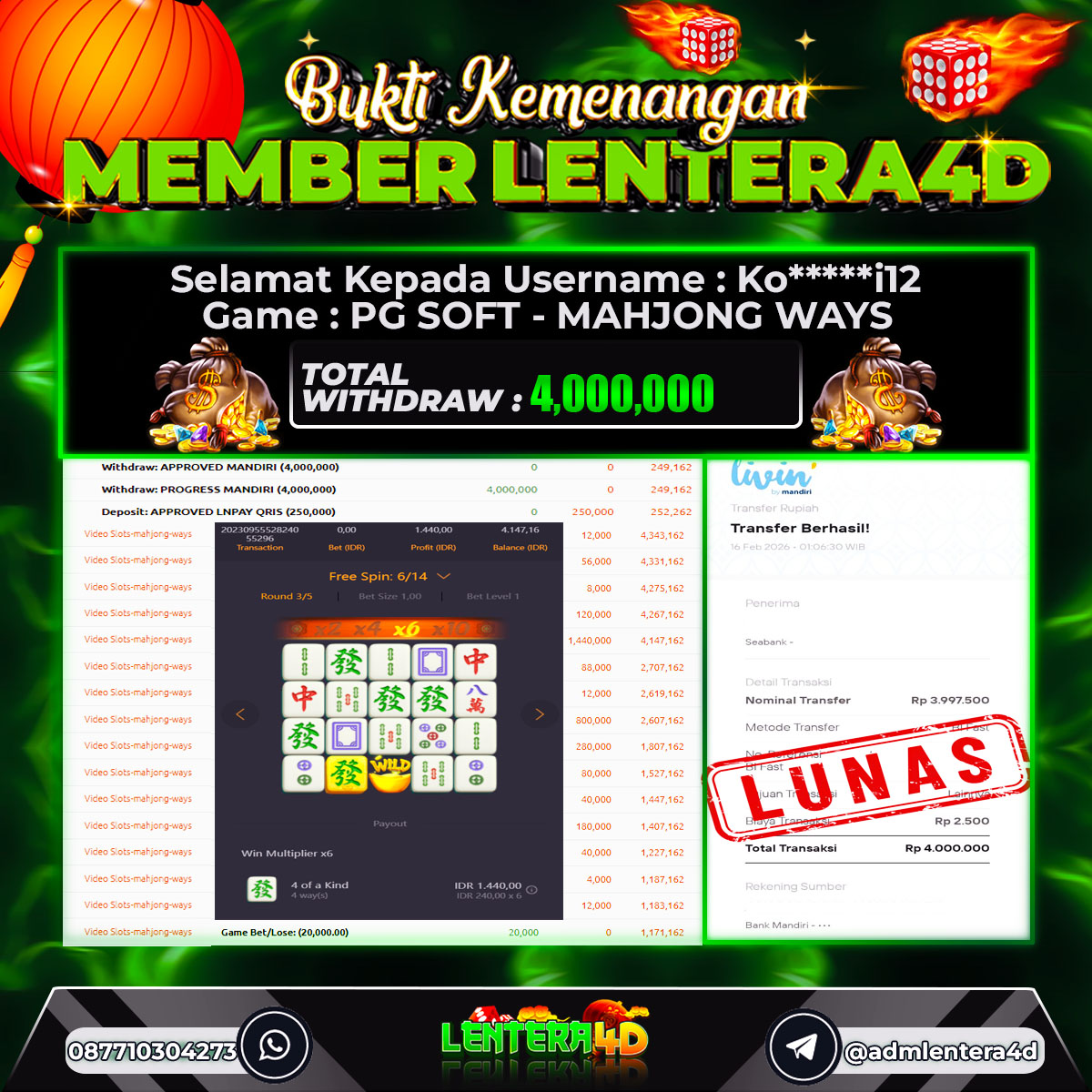 Lentera4D dikenal sebagai situs terpercaya yang selalu menghadirkan pengalaman bermain slot online yang aman, fair, dan berlisensi resmi. Di sini, kami tidak hanya sekadar memberikan janji, tapi bukti nyata berupa slip kemenangan yang dapat Anda lihat secara langsung.