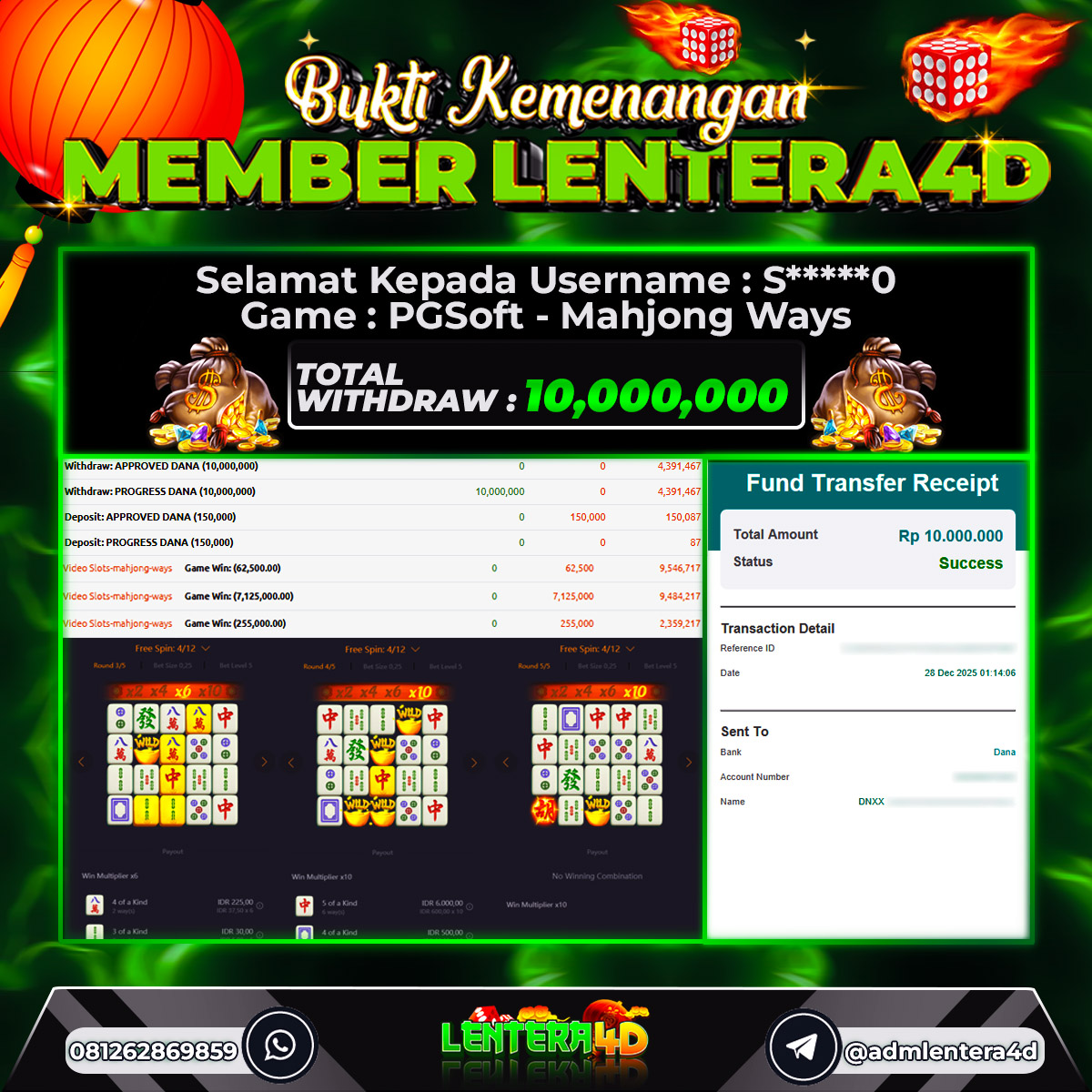 Lentera4D dikenal sebagai situs terpercaya yang selalu menghadirkan pengalaman bermain slot online yang aman, fair, dan berlisensi resmi. Di sini, kami tidak hanya sekadar memberikan janji, tapi bukti nyata berupa slip kemenangan yang dapat Anda lihat secara langsung.