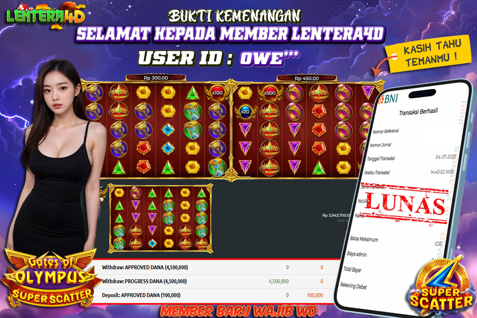 Lentera4D dikenal sebagai situs terpercaya yang selalu menghadirkan pengalaman bermain slot online yang aman, fair, dan berlisensi resmi. Di sini, kami tidak hanya sekadar memberikan janji, tapi bukti nyata berupa slip kemenangan yang dapat Anda lihat secara langsung.