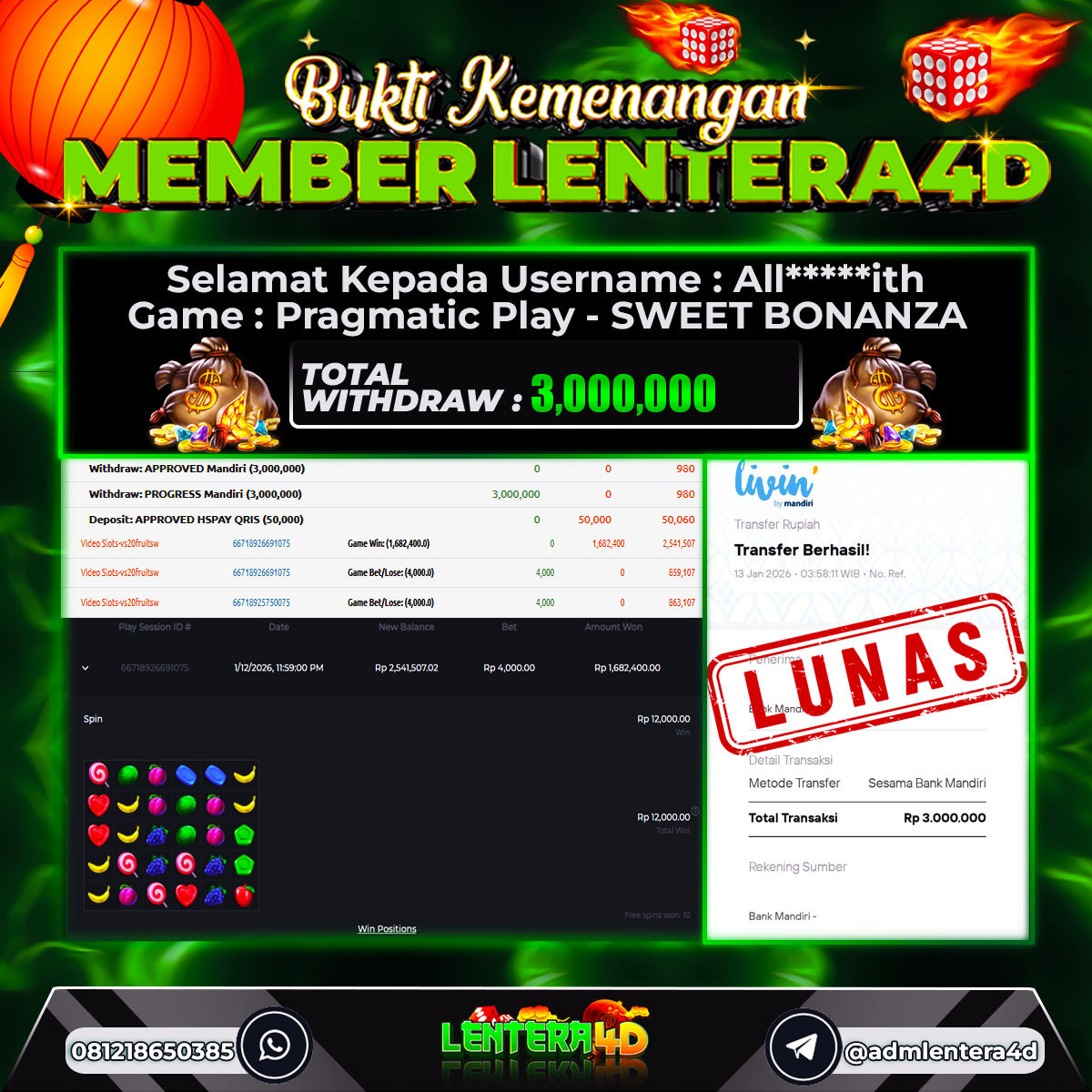 JACKPOT SWEET BONANZA 13 JANUARI 2026, Jackpot Slot Gacor, Kemenangan Slot, Bukti Kemenangan Slot, Kemenangan Slot PRAGMATIC PLAY, Menang Slot online, Slot Gacor, Situs Aman Terpercaya, WD Berapapun Pasti DI Bayar Tuntas, Maxwin Slot Online.