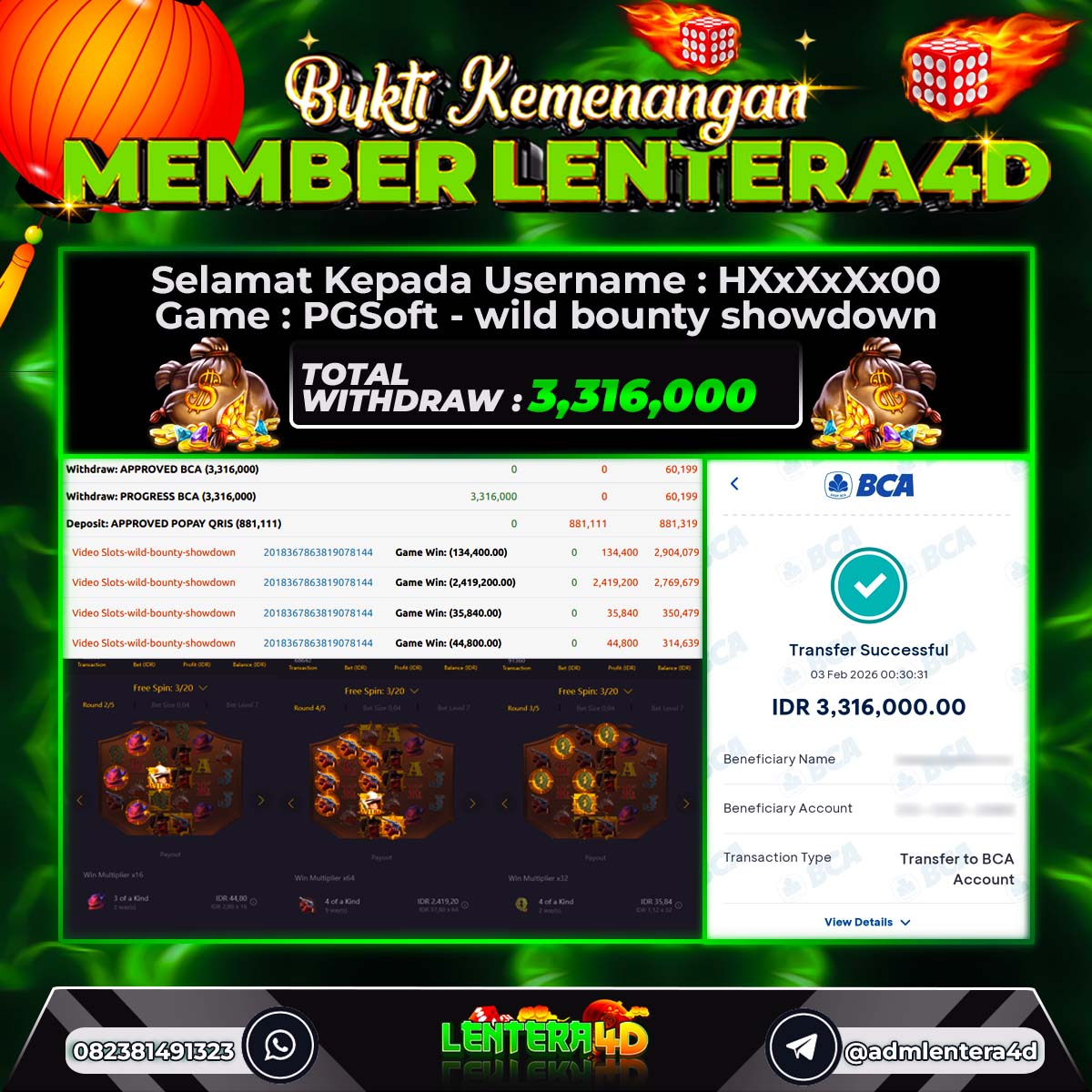 TOTAL KEMENANGAN : Rp. 3.316.000,-